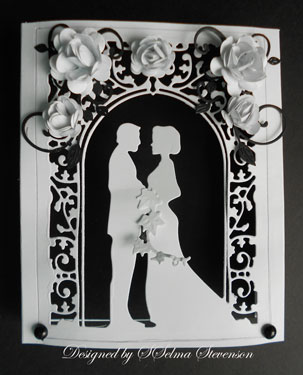 The top of the frame was embellished with roses, created with the Cheery Lynn Medium and Large Rose dies. I created two large roses and three medium roses. Behind the roses is the Cheery Lynn "Mini Fanciful Flourish". Between the Bride and Groom, I used a piece of "Ivy" from Marianne Designs. On each side of the shadow box I add the pretty Cheery Lynn "Mini Flourish Band".